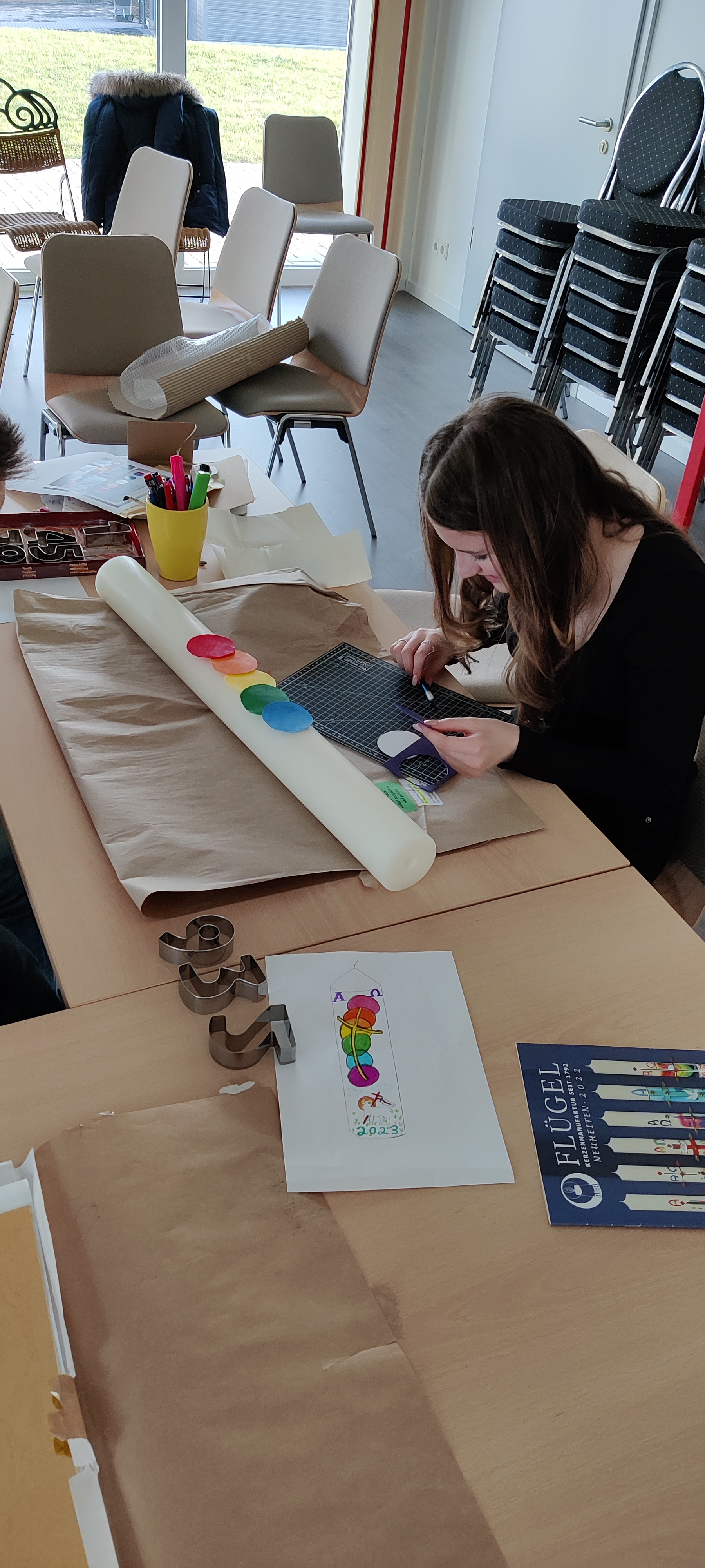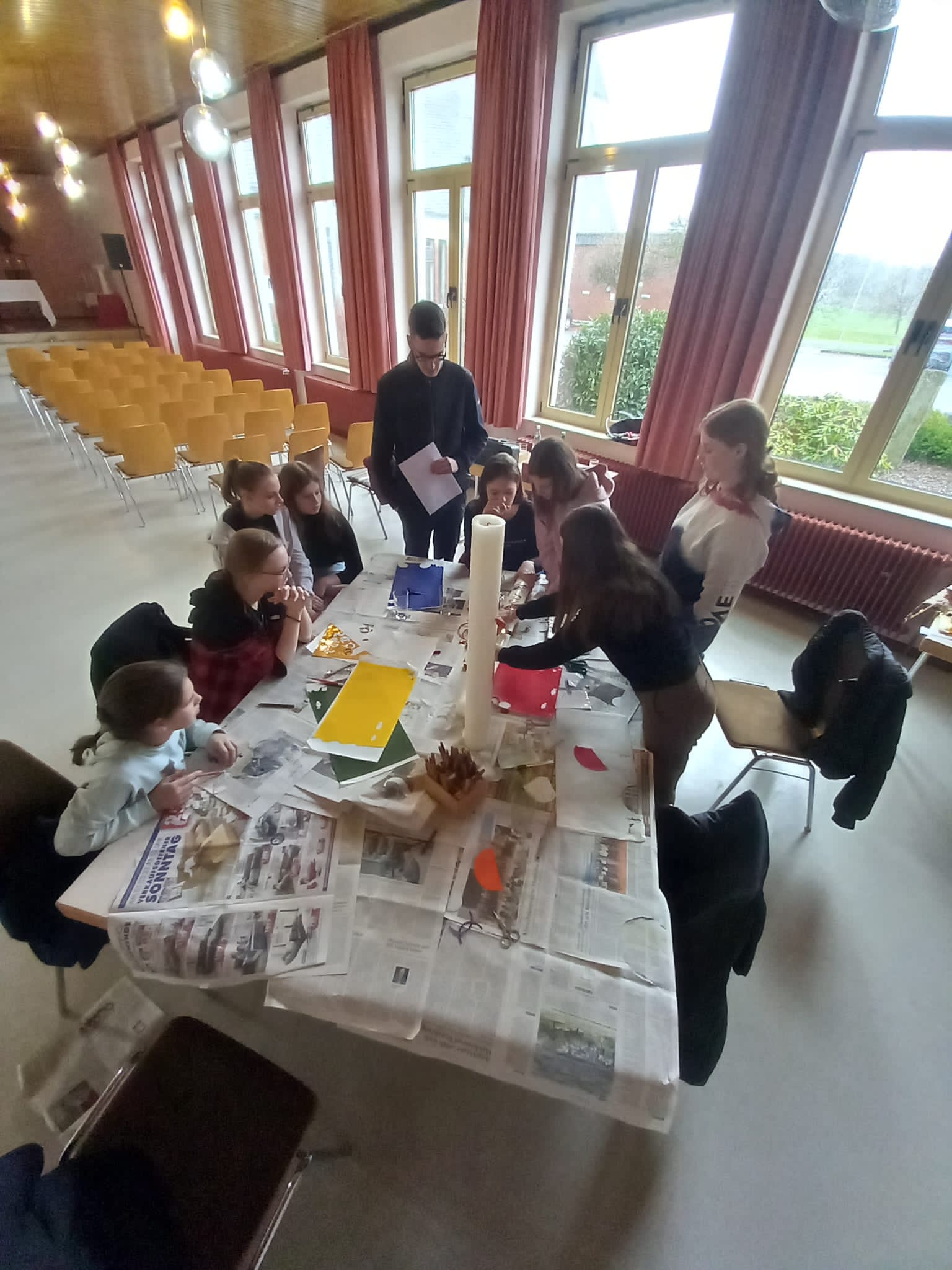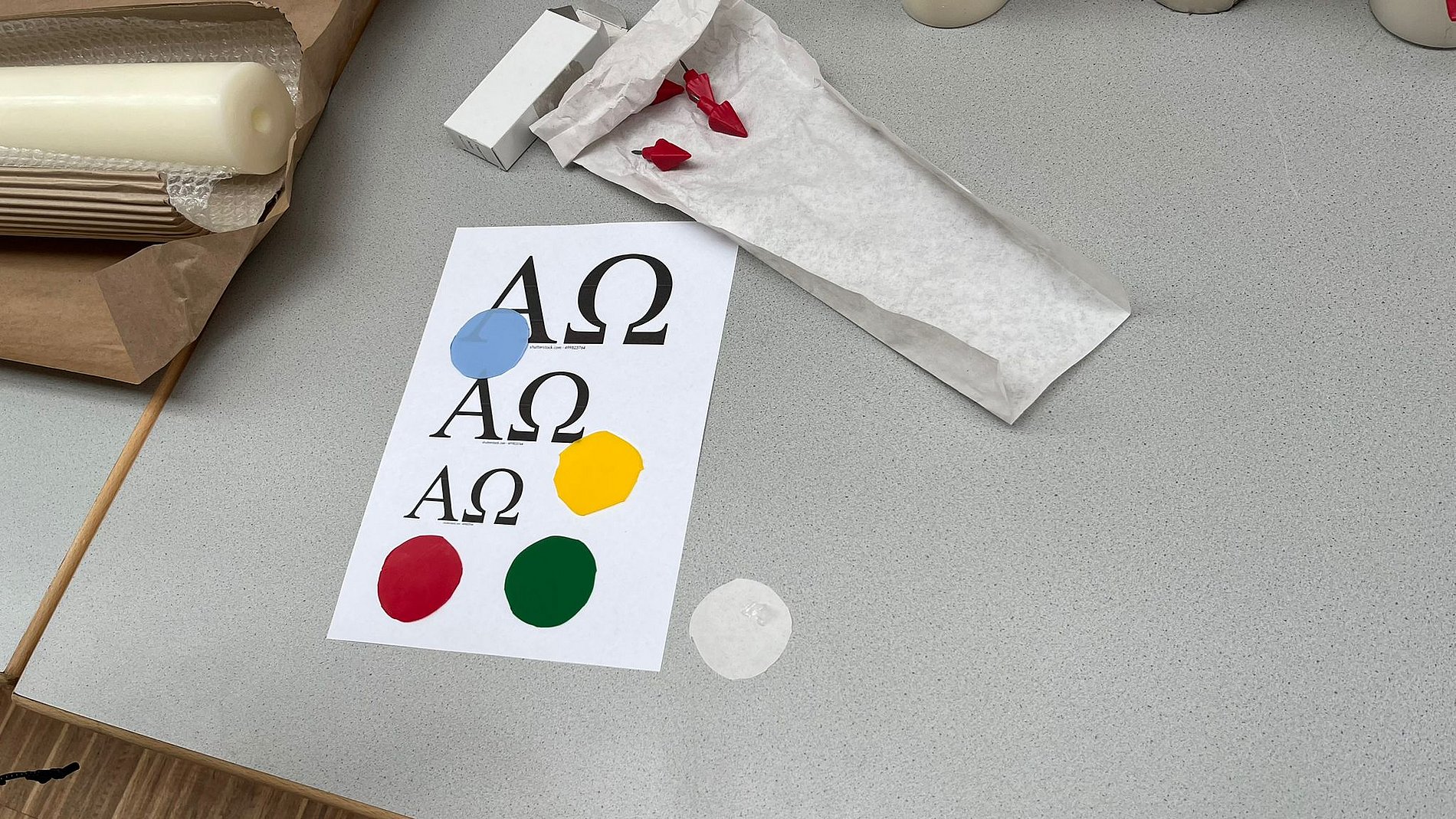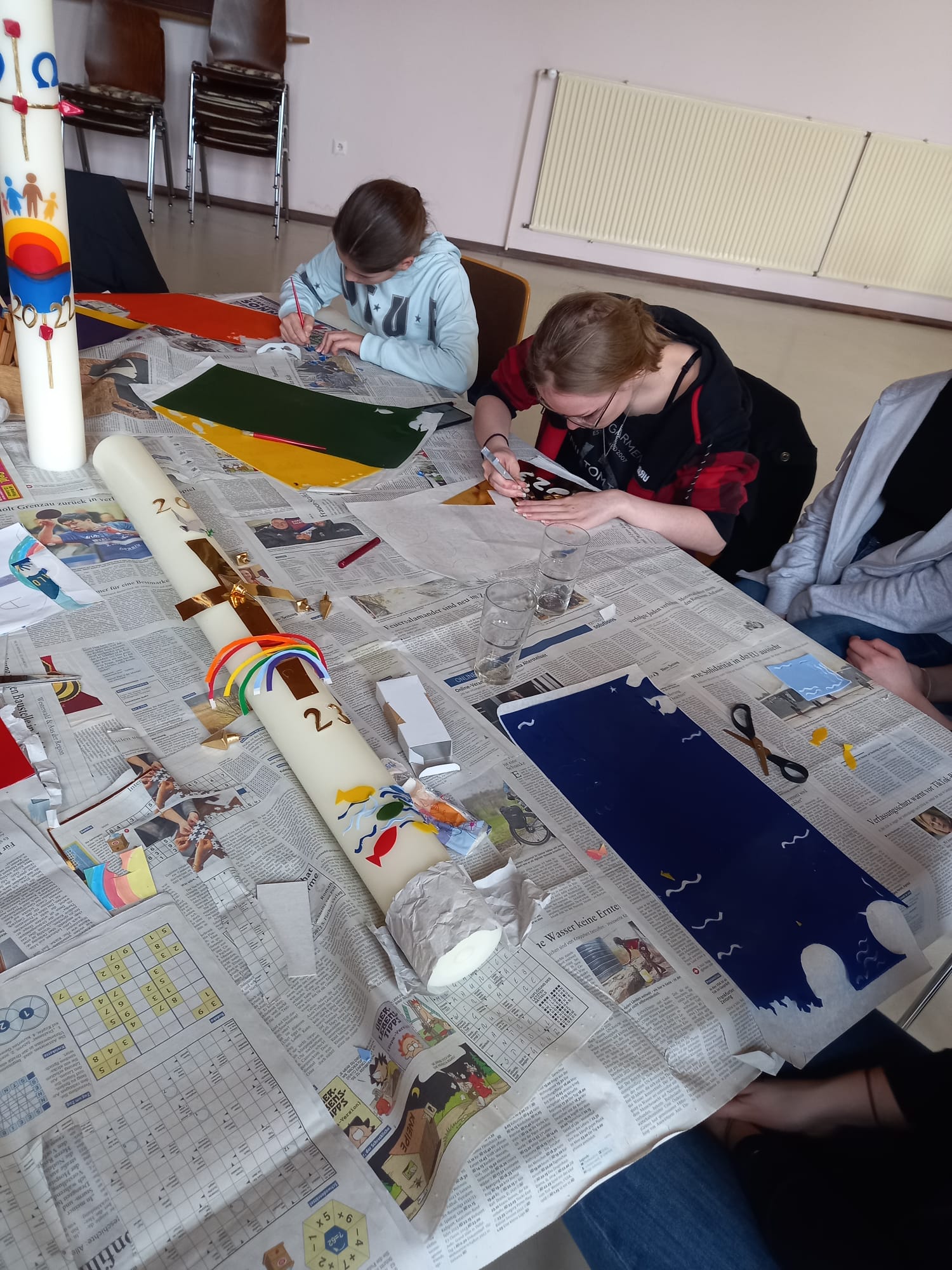 Messdienerinnen und Messdiener gestalten Osterkerzen