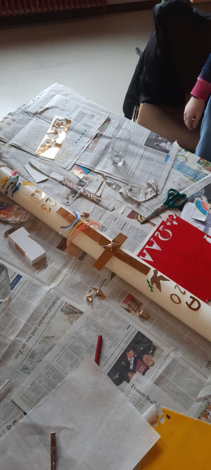 Am 16.03. trafen sich Messdienerinnen und Messdiener aus Hahn um die Osterkerze für "ihre" Kirche herzustellen. Josi hatte einen Entwurf gemacht, der allen gefiel. Jetzt musste er "nur" noch umgesetzt werden. Es wurde beraten, probiert, hin- und hergeschoben, bis es endlich passte. Da stellten sich Fragen wie: "Wie schneidet man Kreise akkurat aus?", "Wie kommen wir um die Löcher für die Nägel drumherum, damit der Entwurf umgesetzt werden kann, wie geplant?" "Wie klappt das mit den Goldschnüren für's Kreuz?" und, und, und.... Und am Ende ... die Osterkerze, fast fertig.... Alpha und Omega fehlen noch, werden aber auch rechtzeitig vor der Osternacht fertig sein.