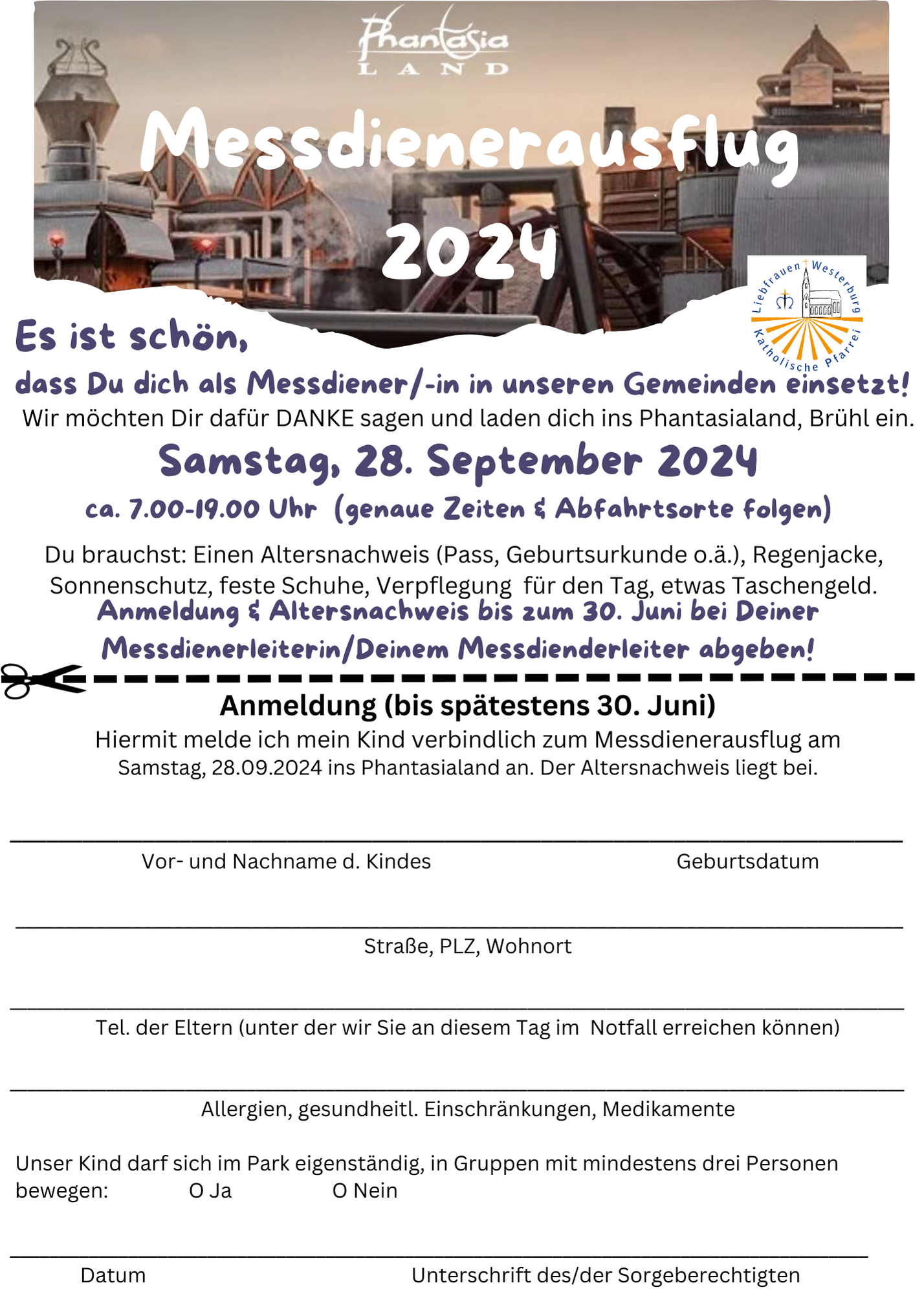 Am 25.09.2022 erlebten 115 Kinder, Jugendliche, Betreuerinnen und Betreuer einen phantastischen Tag im Phantasialand, als "Dankeschön" für den regelmäßigen Ministrantendienst in den Gottesdiensten der Pfarrei.